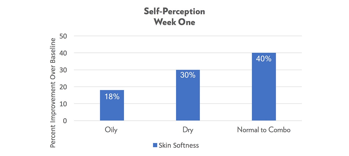 Another interesting point is that the improvements varied by each group. This was to be expected as different skin types have unique needs. Those with oily skin didn’t see the one-week benefits of skin softness (18%) that those with dry (30%) or even normal to combination (40%) skin experienced. This is likely that those with oily skin don’t have as much room for improvement compared to their other skin types.