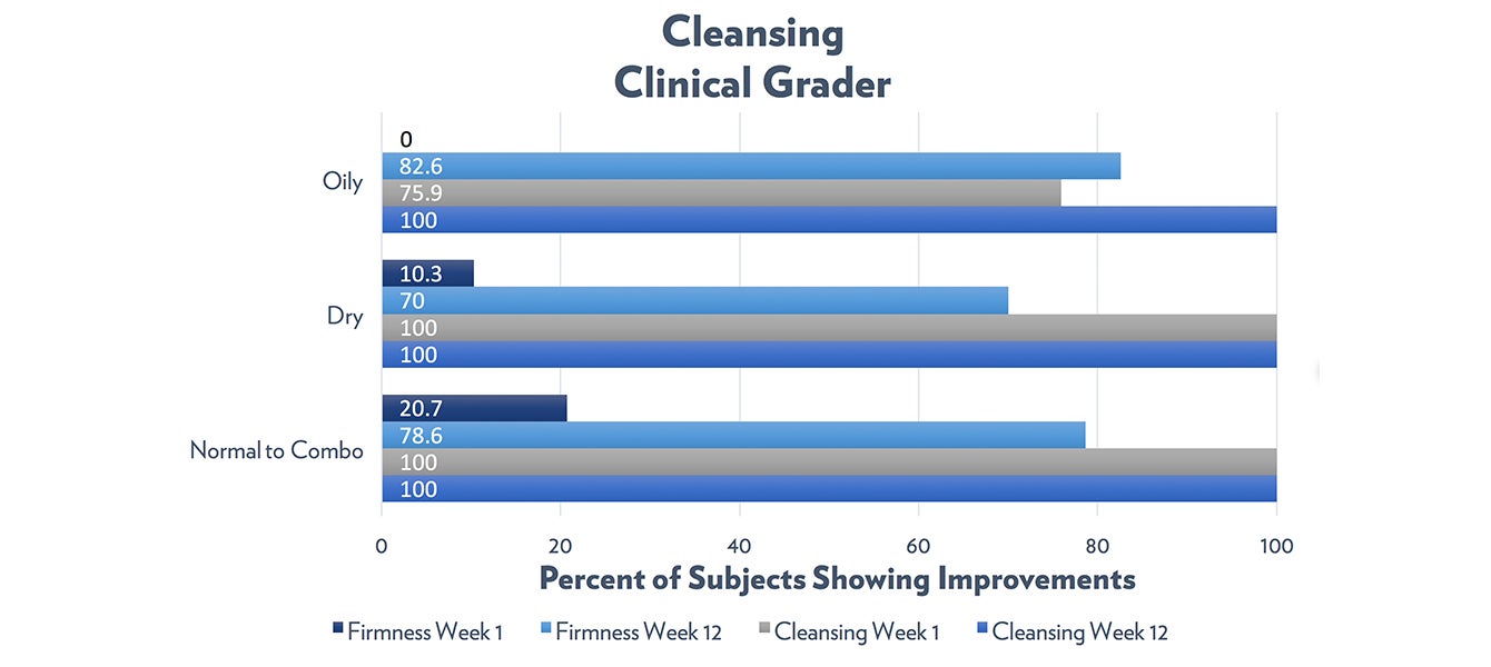 Here again we can see those between group differences. While 100% of subjects were graded to have improvements in skin cleansing, this was seen as early as week one for both the dry and normal to combination skin groups. Yet, it took the oily group longer to get there. Yet, visible improvements in skin firmness was less pervasive in the dry group compared to the oily and normal to combination groups.